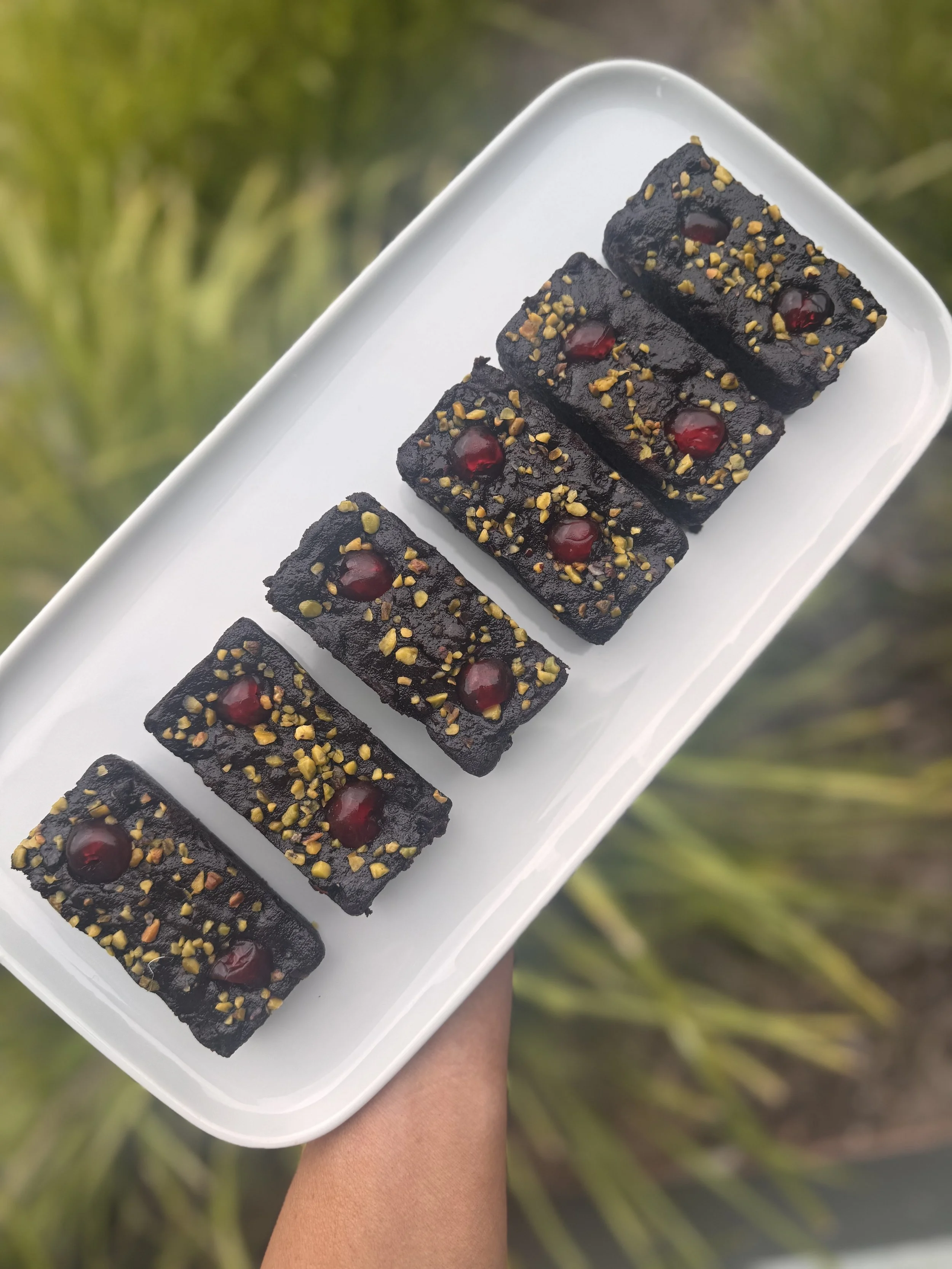 From Shepherd’s Artisan bakehouse. A decadent GF chocolate brownie infused with festive fruit, pistachios, rum, and spice — rich, indulgent, and perfectly seasonal. (contains egg, pistachio, sulphites. May contain sesame, other tree nuts, milk, soy, peanut)