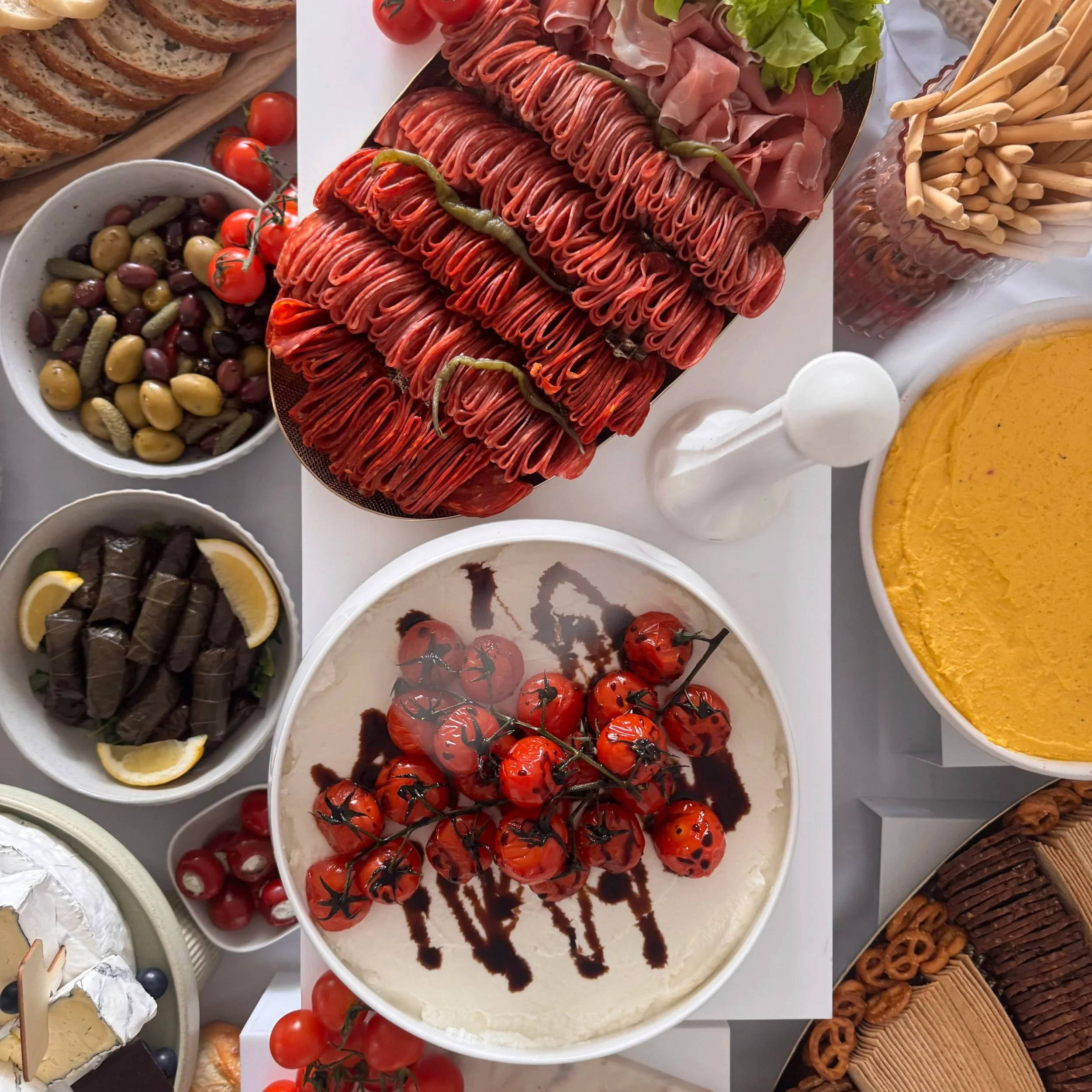 Crostini, Falafel Bites, Sliders, Arancini, Burrata Platter.